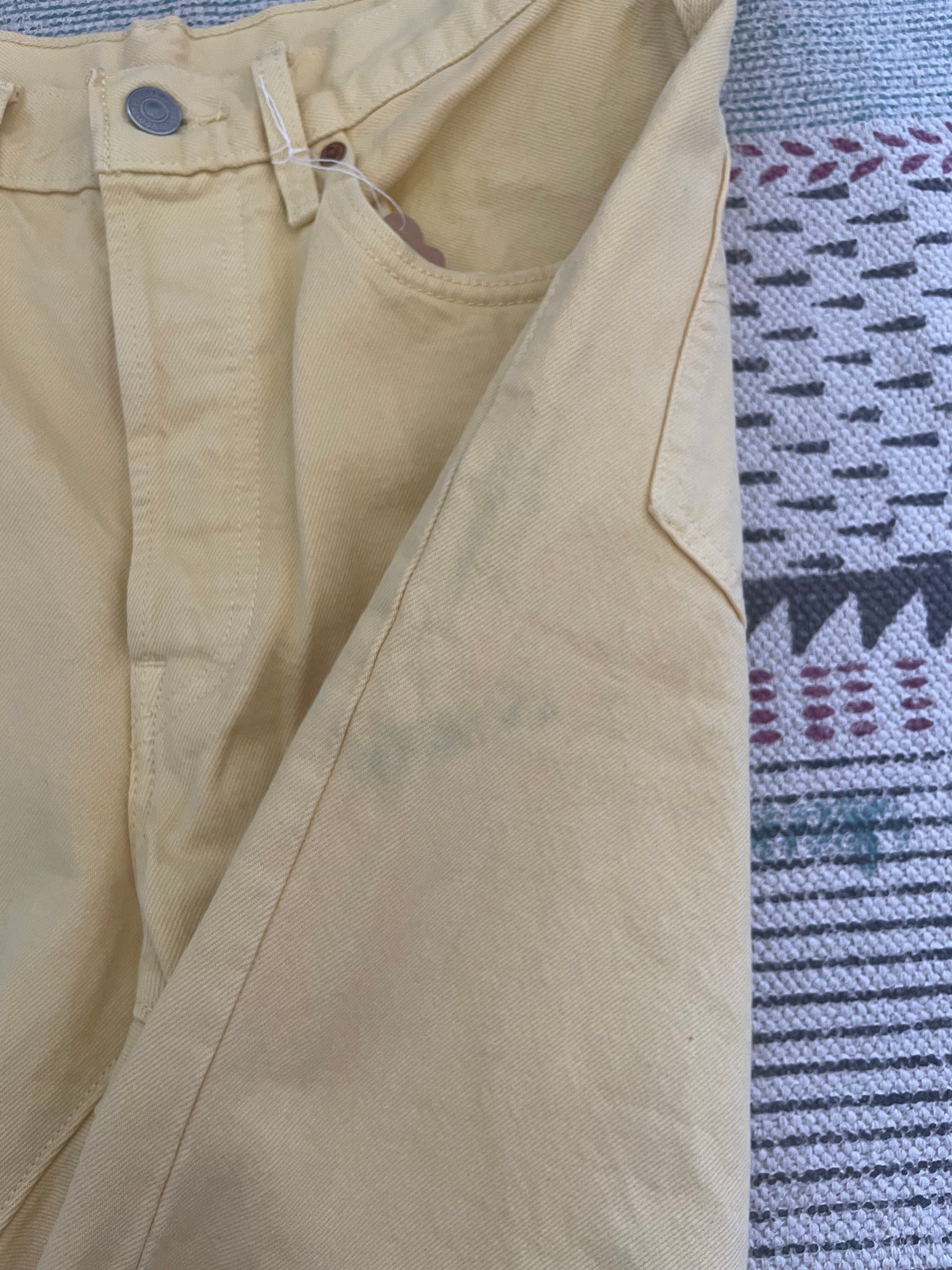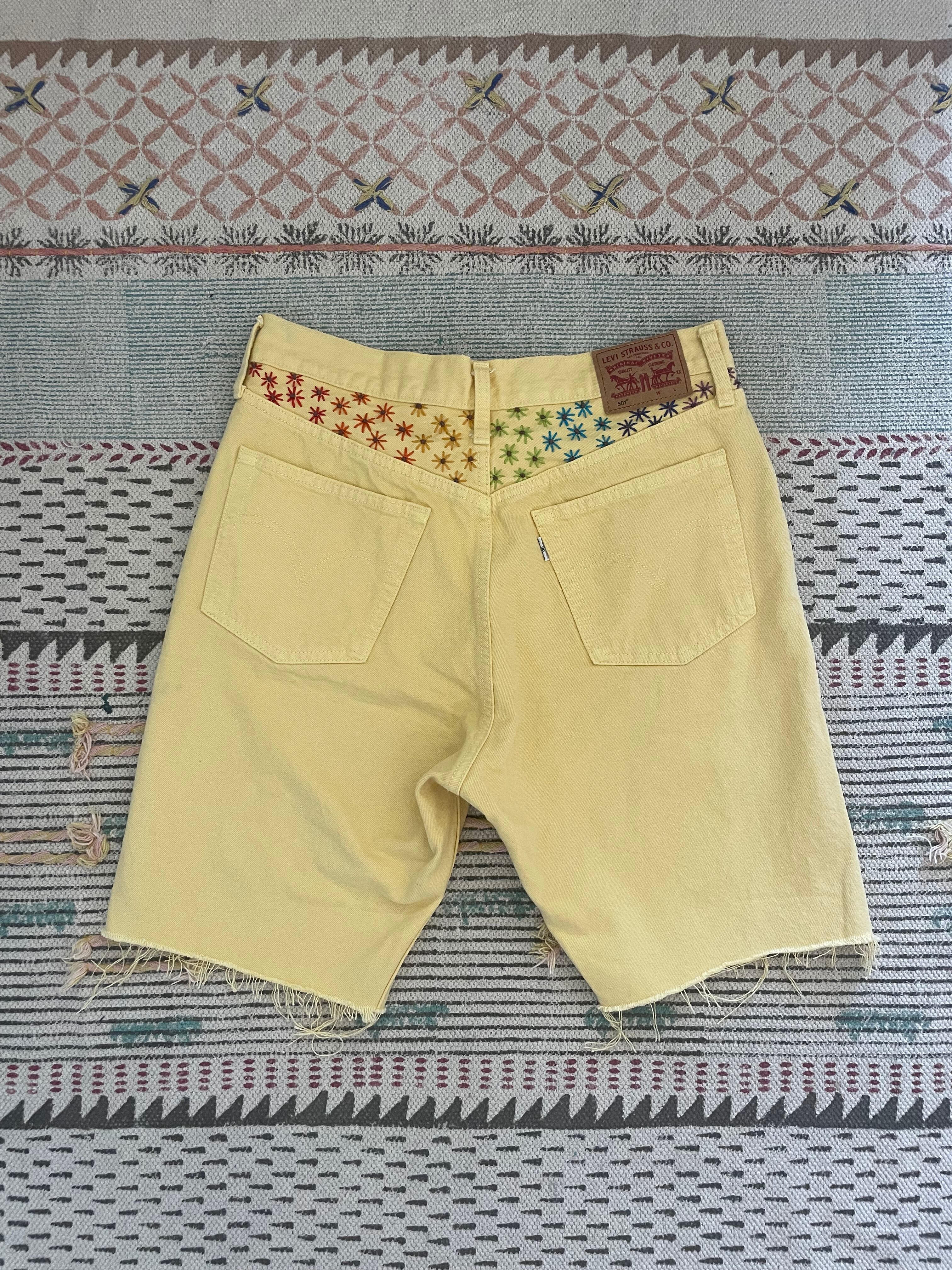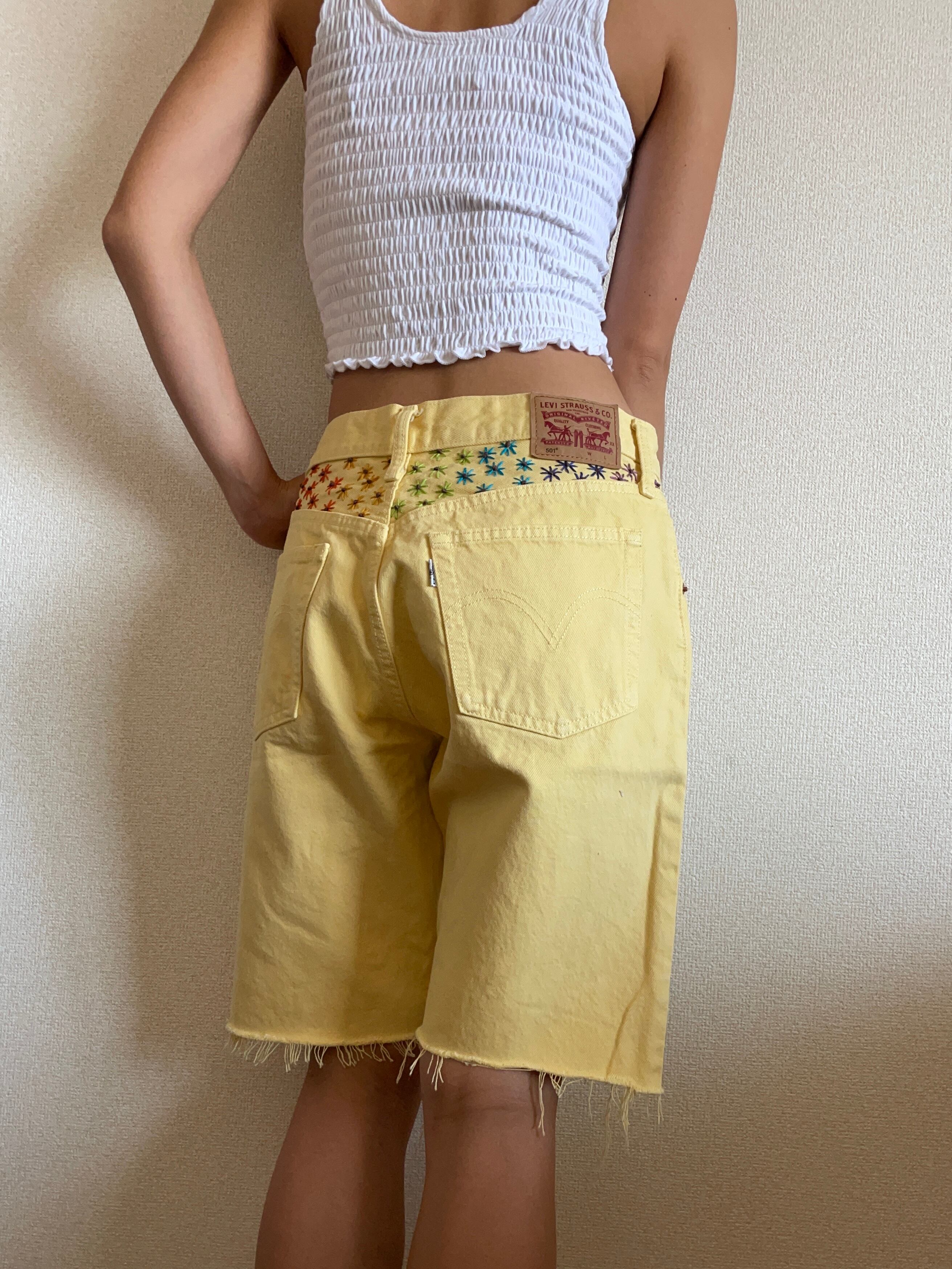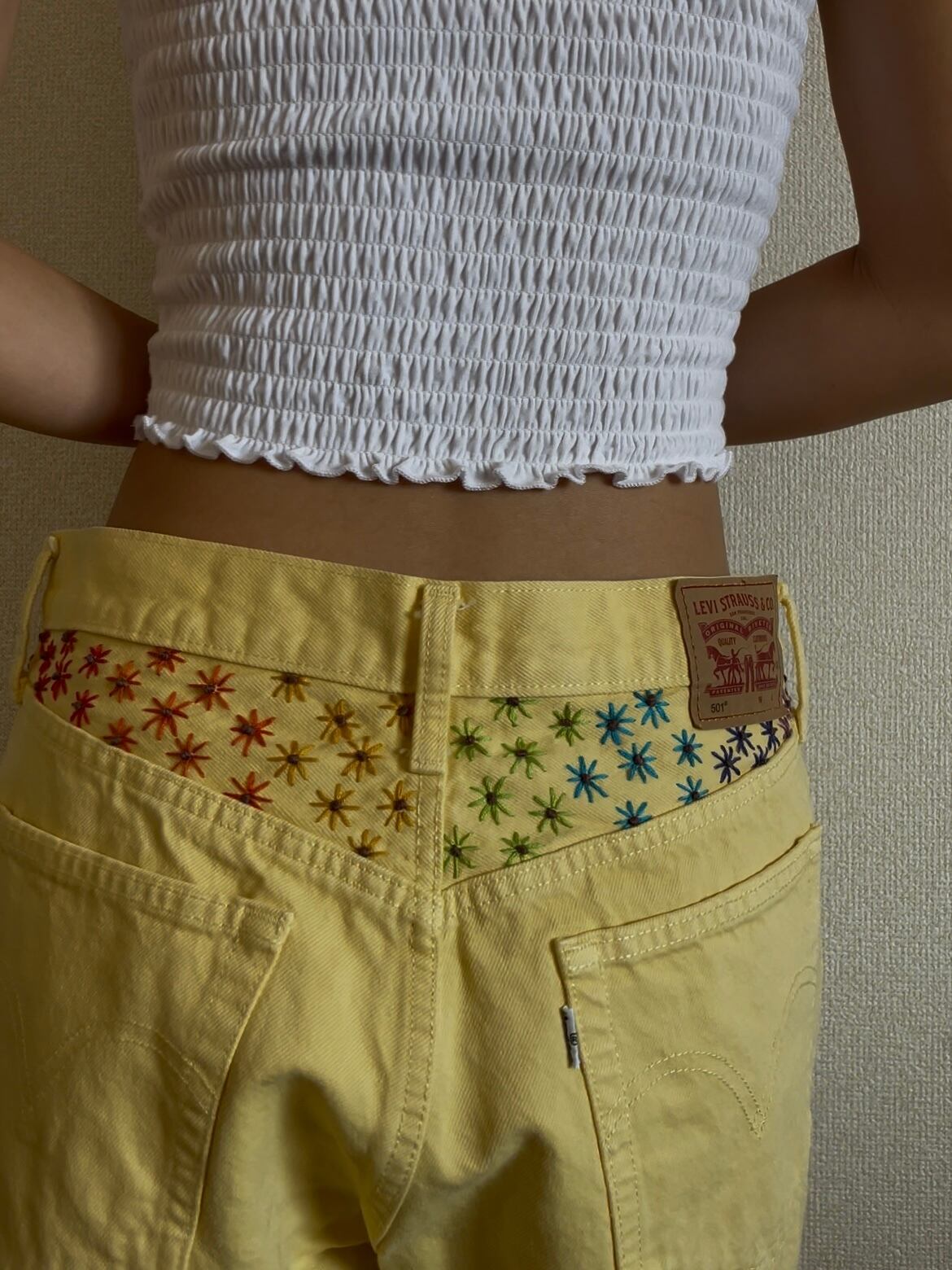 Levi's yellow denimにレインボーなお花を刺しゅうしました。夏のコーディネートにビタミンカラーをいかがでしょうか。